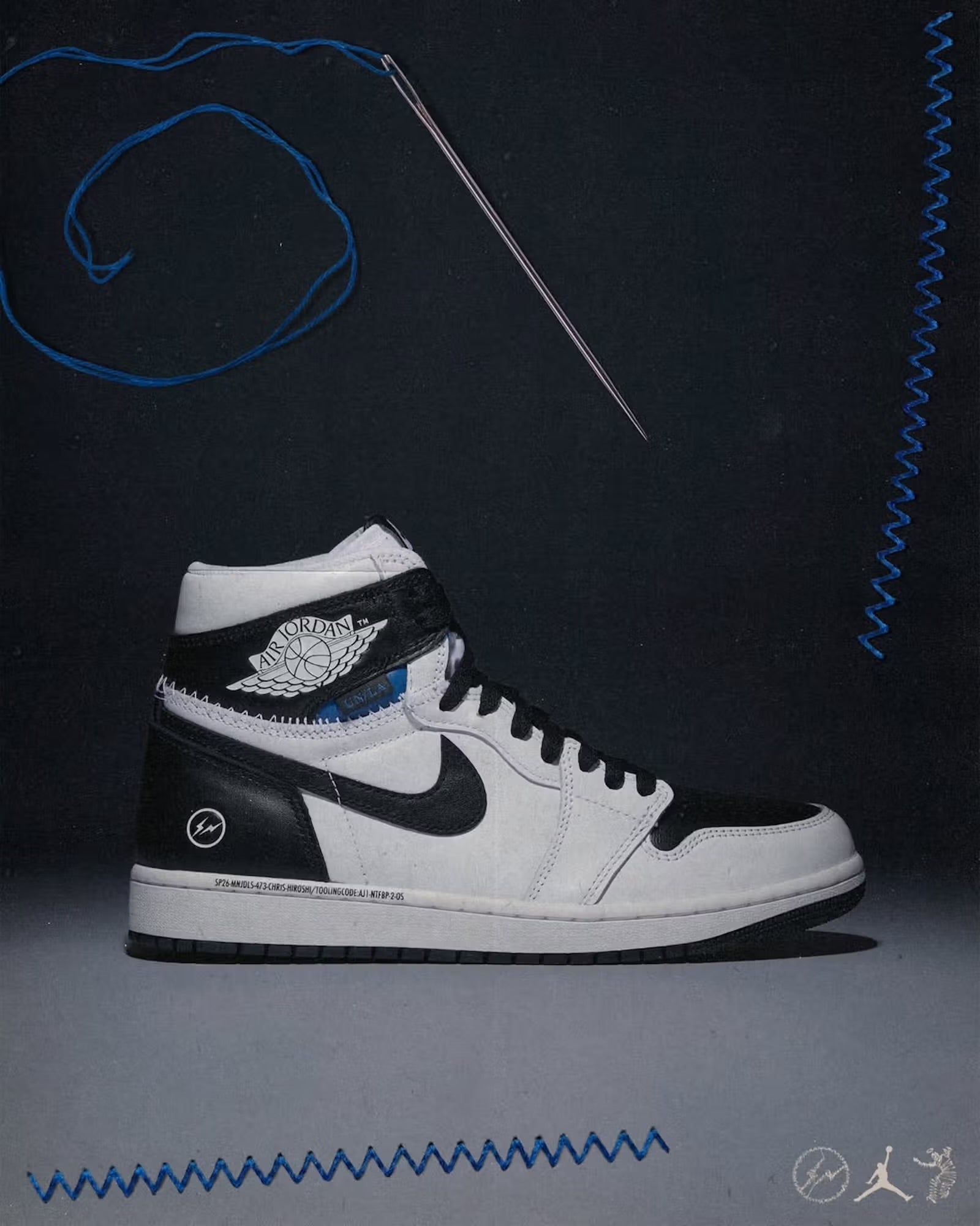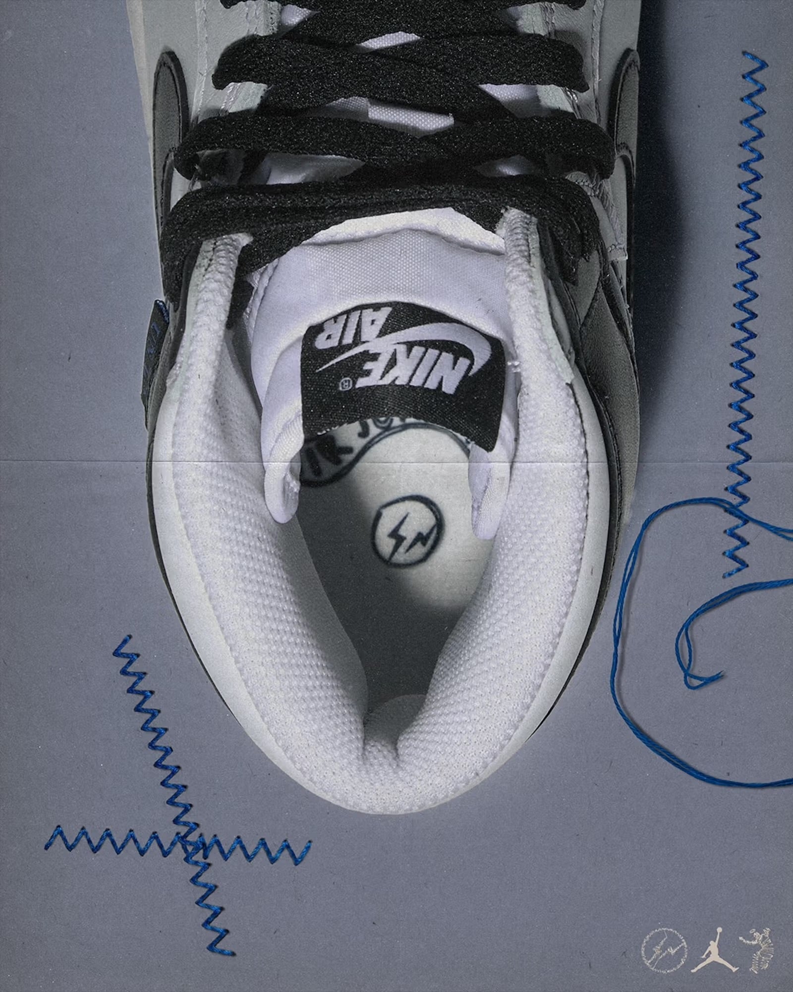 Le Air Jordan 1 bicolore di Union e il frammento presentano una finitura prevalentemente "incolore" sulla tomaia e sulla suola. Le scatole delle dita dei piedi, i pannelli inferiori del tallone, l'ambiente del colletto e gli swoos del profilo si abbandonano al contrasto "nero". La cucitura a zig-zag resa popolare dalla collaborazione AJ1 di debutto di Gibbs del 2018 appare intorno alla spina dorsale. L'iconico timbro fulmine di Fujiwara è inciso sul tallone laterale.