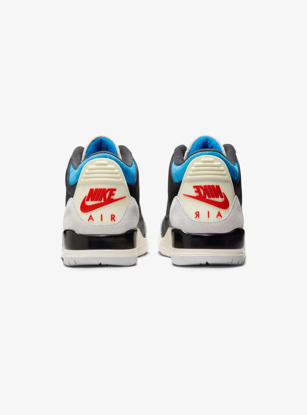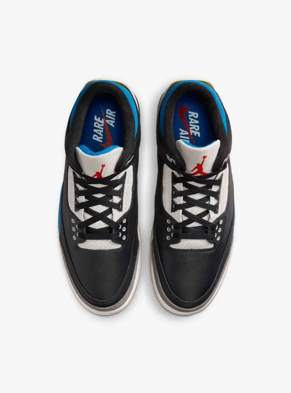 Le Air Jordan 3 Retro OG Rare Air presentano una combinazione cromatica accattivante, che fonde tonalità di Nero, Rosso Chile, Grigio Neutro, Blu Military e Coconut Milk. La base in nubuck nero dona un look elegante e moderno, mentre la zona della punta è arricchita da inserti in pelle grigia che si estendono fino al tallone, sostituendo il classico elephant print con un approccio più minimal ma altrettanto riconoscibile. Il gioco di contrasti tra materiali premium e colori sofisticati è pensato per attrarre sia i collezionisti storici che i nuovi appassionati del brand.