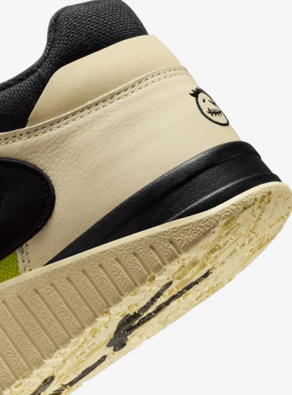 Un elemento immancabile per i veri fan di Travis Scott è il logo Cactus Jack impresso sul tallone, un simbolo distintivo ormai iconico nel mondo delle collaborazioni tra moda e musica, che aggiunge ulteriore valore alla sneaker rendendola un autentico pezzo da collezione. La suola, realizzata in gomma color crema, assicura un'ottima trazione e lunga durata nel tempo. Sul fondo della scarpa spicca in modo deciso la scritta "Jack" in grandi lettere nere, un dettaglio audace che conferisce ancora più personalità al design complessivo e sottolinea l'identità unica della collaborazione.