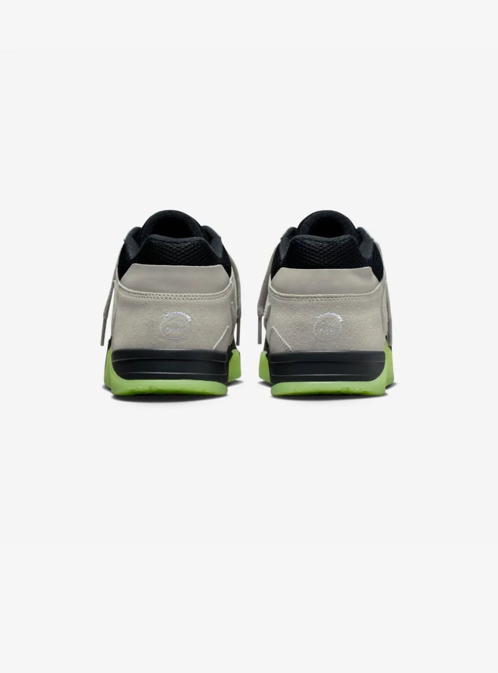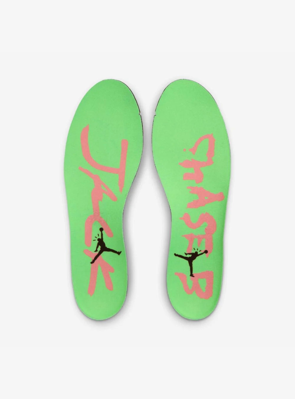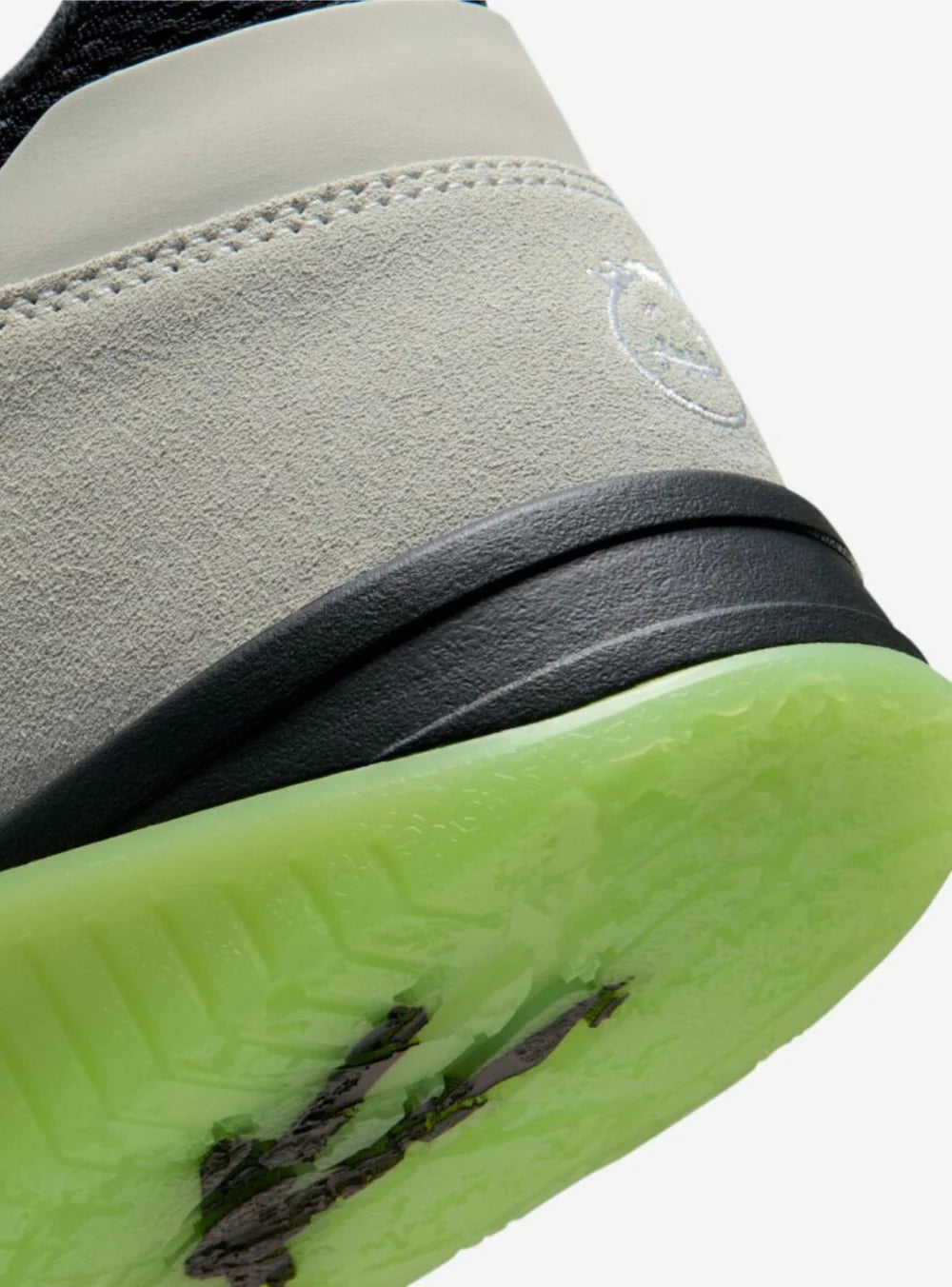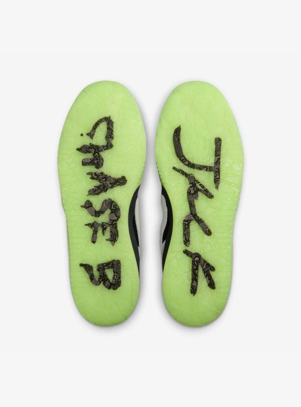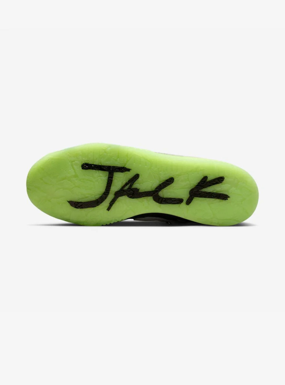 A catturare immediatamente l’attenzione è la suola verde glow-in-the-dark, che aggiunge un contrasto deciso e rende la sneaker immediatamente riconoscibile anche in condizioni di scarsa luce. Sul forefoot strap campeggia il logo “TS” di Travis Scott, un dettaglio distintivo che personalizza ulteriormente il modello e rafforza il legame con l’artista. Gli accenti cromatici vivaci completano un design pensato per emergere.
