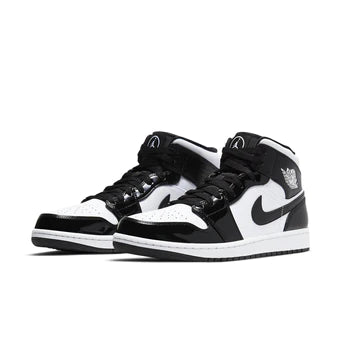 Le Air Jordan 1 Mid SE 'All Star 2021' celebrano la pausa di mezza stagione della NBA regalando all'iconica silhouette un'importante tavolozza di colori bicolore con nuove caratteristiche. La tomaia è realizzata in pelle bianca con sovrapposizioni in vernice nera sull'avampiede e sull'occhiello. Lo Swoosh, il risvolto del colletto e il tallone sono tutti realizzati con la stessa pelle nera lucida, ma sono accentati con un motivo simulato in fibra di carbonio. Un emblema Jumpman ad anello è visualizzato su un'etichetta cucita sopra la linguetta.