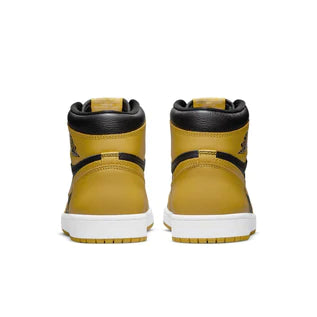 L'Air Jordan 1 High Retro OG 'Pollen' ha un blocco colore che ricorda un altro modello da basket introdotto nel 1985. La tomaia in pelle ricorda la colorazione Dunk 'Iowa' originale, con una solida base nera con sovrapposizioni di giallo Pollen a contrasto. Un emblema Jordan Wings in rilievo sulla patta laterale del colletto e un'etichetta Nike tessuta sulla linguetta in nylon sono componenti tradizionali del marchio. La parte alta è costruita su una suola preformata in gomma convenzionale che è stata aumentata con una zeppa in poliuretano e un'ammortizzazione Air-sole incapsulata sotto il tallone.