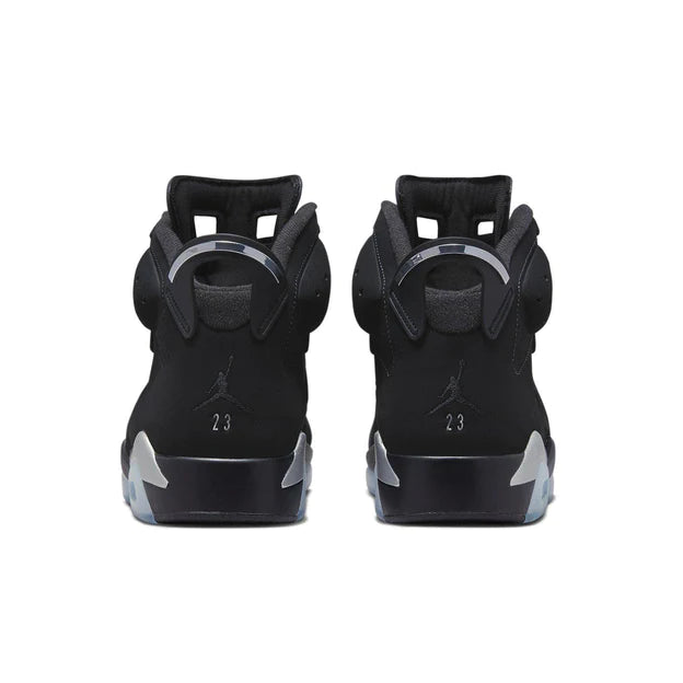L'Air Jordan 6 Retro "Chrome" presenta un design familiare visto in precedenza sull'Air Jordan 6 Low "Chrome" del 2015. La tomaia è realizzata in solido nabuk nero con marchio Jumpman argento sulla protezione dei lacci. I dettagli standard AJ6 rimangono intatti, tra cui una linguetta con finestra, chiusure in pizzo e un'etichetta sul tallone simile a uno spoiler. Il mid-top è montato su un'intersuola in poliuretano nero, accentuata da dettagli in argento metallizzato e supportata da una suola in gomma traslucida.