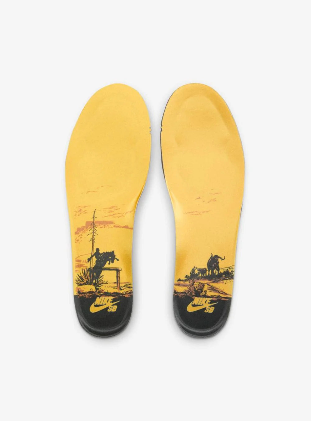 Le Nike SB Dunk Low Rodeo Tourmaline si distinguono per una tomaia vivace in verde tourmaline, messa in risalto da bordature arancioni Monarch, dettagli Baroque Brown e una suola rossa vivace che cattura immediatamente l’occhio. Ogni elemento è pensato per rendere omaggio ai motivi iconici del West, come dimostrano i raffinati ricami in stile Sonora sul tallone, la stella western e il logo “NIKE” sagomato come una corda da lazo. Questi dettagli non sono solo decorativi, ma raccontano una storia di resilienza e orgoglio. All’interno, le sneakers nascondono una sorpresa narrativa: le solette stampate in giallo raffigurano un cowboy che cavalca attraverso un deserto illuminato dal tramonto, rafforzando il legame emotivo con la storia dei cowboy neri e del loro coraggio nel superare le difficoltà della frontiera. A completare questo storytelling unico, la confezione include un fazzoletto giallo con la scritta “What’s gonna happen is gonna happen”, un chiaro richiamo alla forza d’animo e all’accettazione delle sfide della vita.